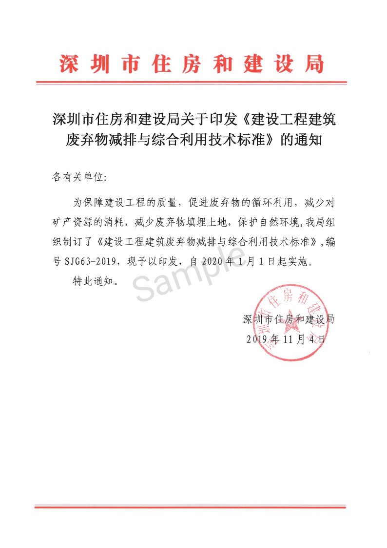 建筑廢棄物排放限額標(biāo)準(zhǔn)將于2020年1月1日起正式實施! 兩項標(biāo)準(zhǔn)的落地實施,讓建廢綜合利用產(chǎn)品得以全面推廣使用,促進資源經(jīng)濟可持續(xù)循環(huán)發(fā)展,同時我司也將用高標(biāo)準(zhǔn)和實際行動踐行文中要求,助力深圳更好更快的建設(shè)中國特色社會主義先行示范區(qū)。